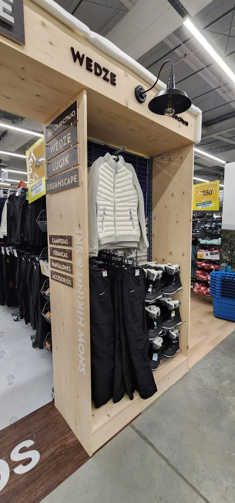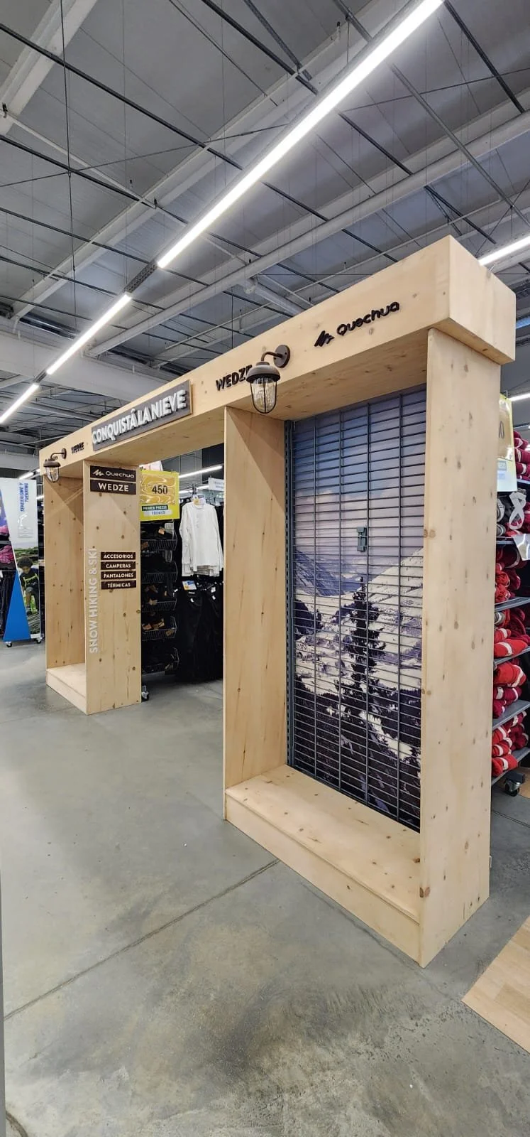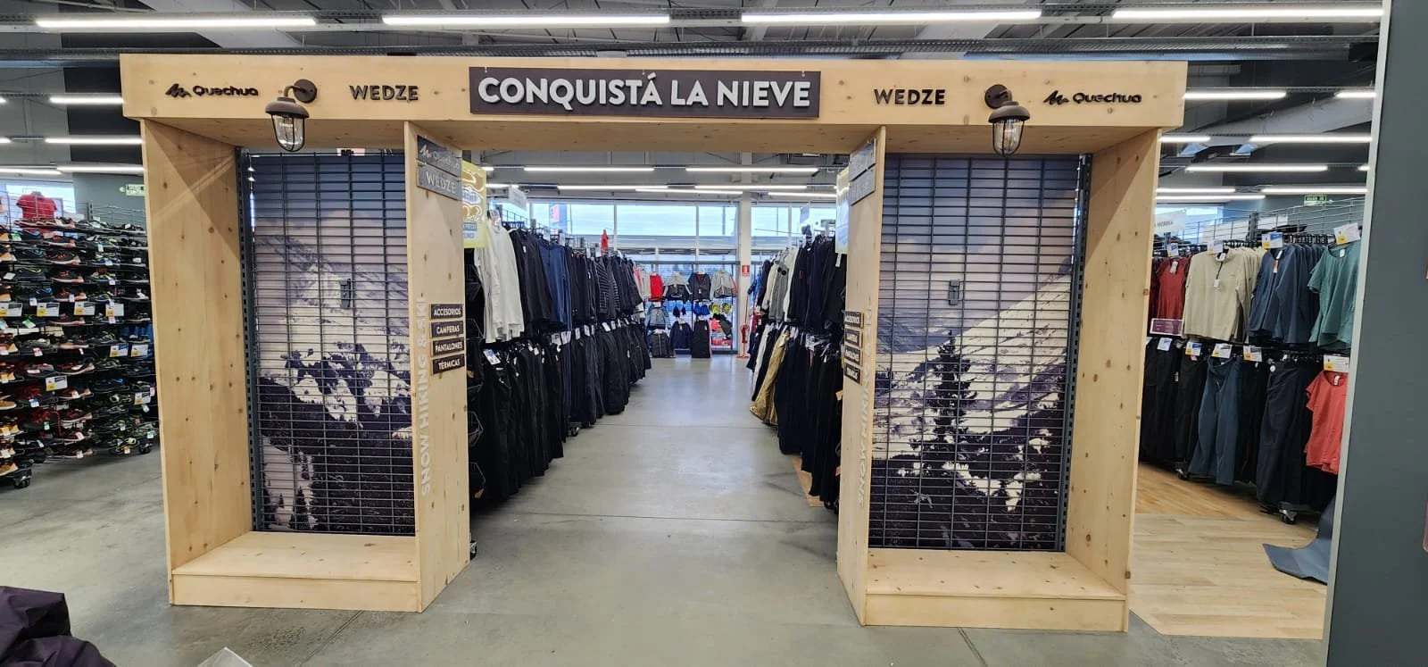 El corazón de la campaña es un espacio inmersivo que lleva la aventura al punto de venta. El pórtico de entrada, formado por dos cabeceras y una viga de madera, crea una puesta en escena auténtica y llamativa. El suelo vinílico laminado recrea la textura de la nieve, con huellas de calzado, sumergiendo a los visitantes en una atmósfera montañosa